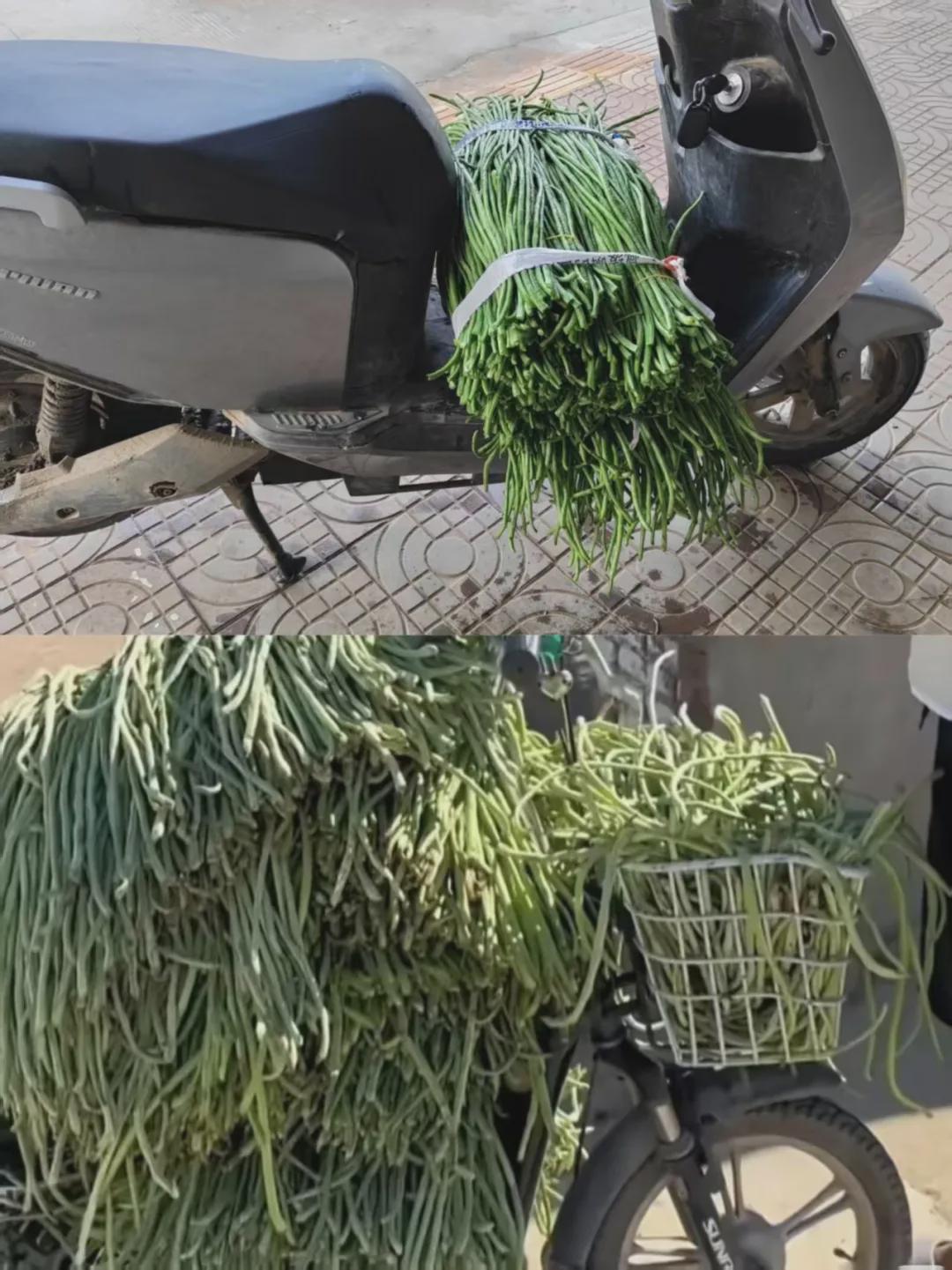 网友@骑着单车看夕阳 拍下早高峰奇观:电动车车把上挂满豆角,后座绑着麻袋,远远看去像移动的“豆角树”。