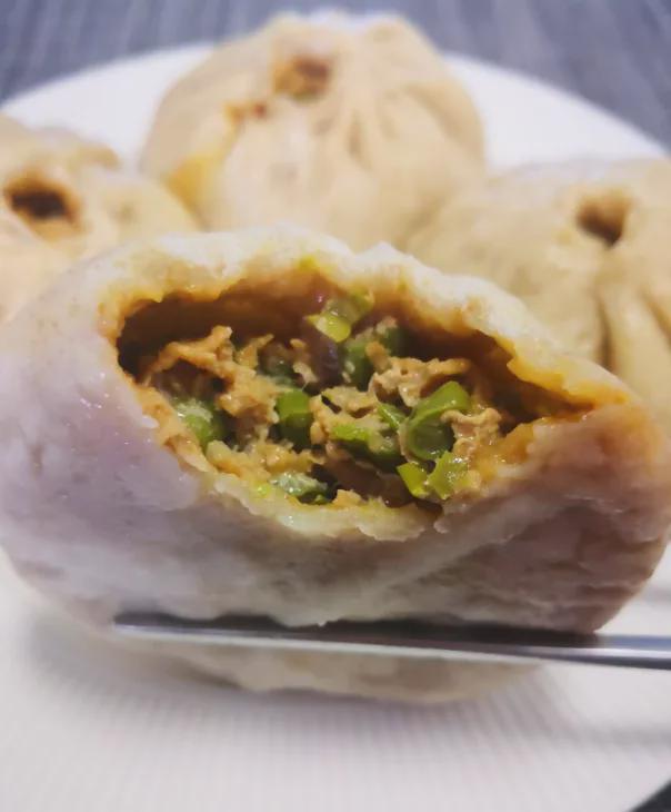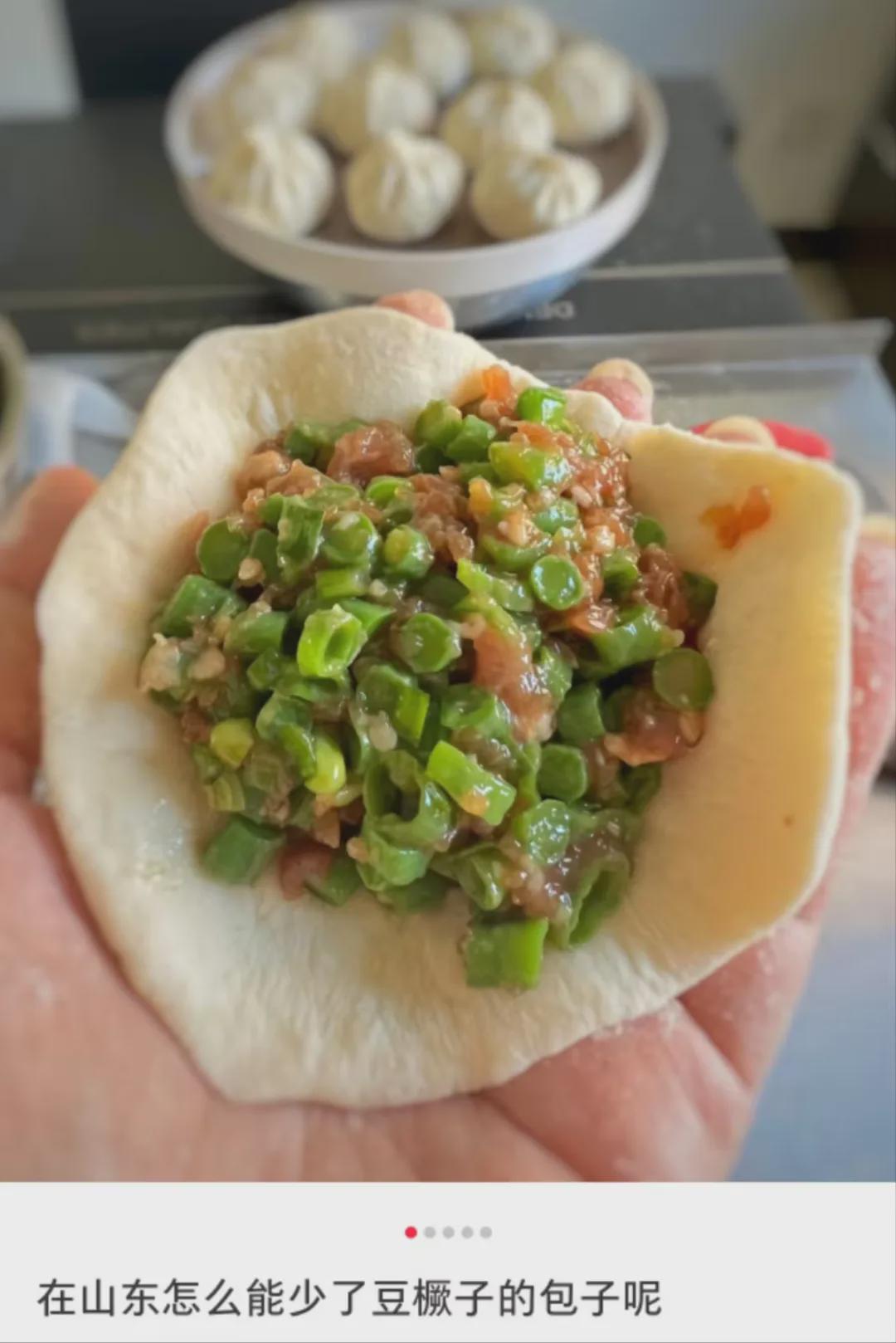剁碎的豆角拌上肉块、鸡蛋和虾皮,包进发面皮里蒸熟,咬一口满嘴清香。在不少山东农村集市上,早上五点就有人排队买,有些老头老太太一天三顿都吃这个。