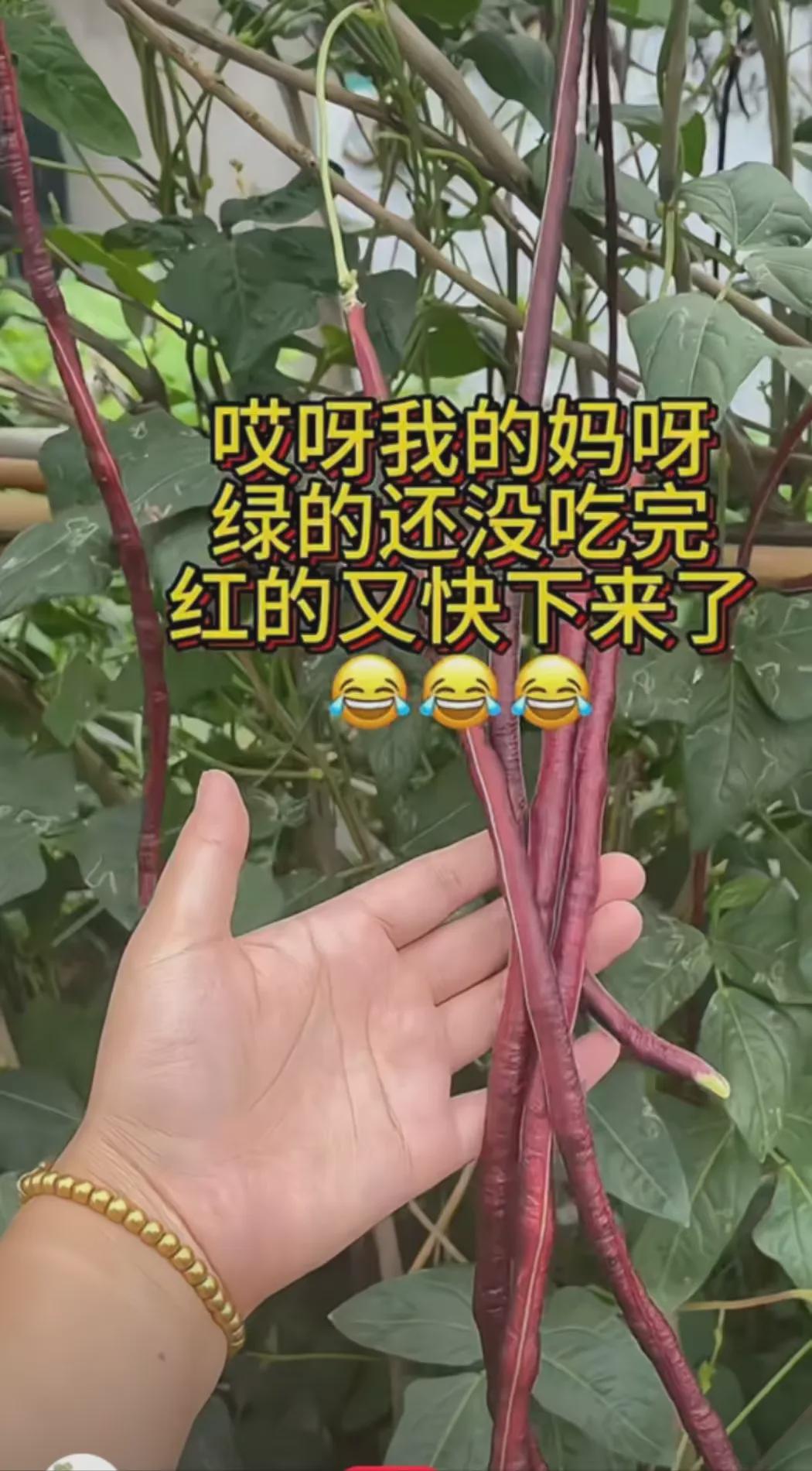 社交平台上一位小姐姐分享自家豆角棚:“前天刚摘了两筐,今儿又摘一筐半,天天都能吃上新鲜的,根本摘不完,这绿豆橛子还没吃完,红的又快下来了。”