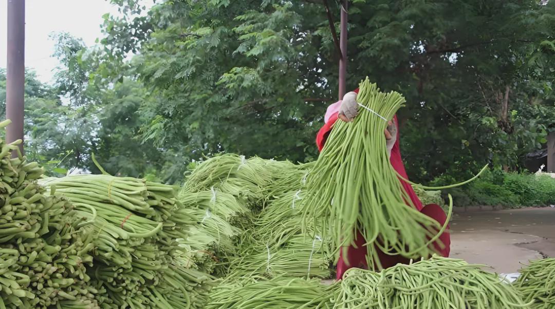 菜市场里,成捆的豆角堆成小山。街头巷尾,电动车车把挂豆角、自行车后座驮豆角的景象比比皆是。