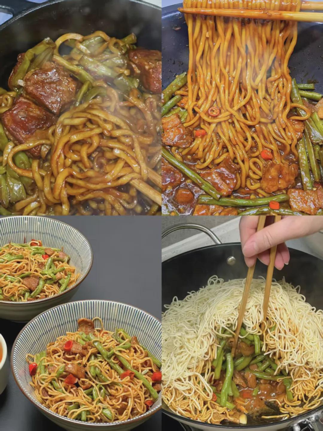 劲道的手擀面,配上煸得微微焦香的豆角,再浇上一勺五花肉炒出的油脂,焖到汤汁收干,面条吸饱了豆角的鲜甜和肉香,一掀锅盖,那味道能香晕整栋楼。@碳水教父 说:“我妈做的豆角焖面,我能连吃三碗,最后舔盘子的时候,连我家狗都嫌弃我。”