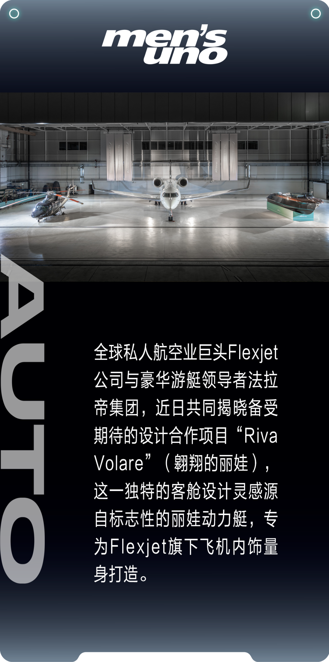 这套最终设计于6月26日(周四)在米兰利纳特机场的Milano Prime专区举行的官方揭幕活动上亮相,现场静态展示了Flexjet的湾流G650、西科斯基S-76直升机及丽娃Aquariva Special动力艇。此次揭幕活动在SEA Prime为Flexjet姊妹公司Sirio(飞机管理与维护服务商)新建的机库内举行。SEA Prime是意大利及欧洲领先的商务与通用航空基础设施供应商,以“Milano Prime”品牌运营。