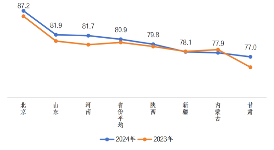 建设数字乡村是实现共同富裕的重要引擎。2024年数字乡村建设满意度达80.9分,较2023年提升0.7分,连续两年保持增长。分省市看,北京以87.2分领跑,山东、河南超81分形成“第二梯队”;甘肃后发优势显著,满意度提升2.3分,成为进步最快省份。