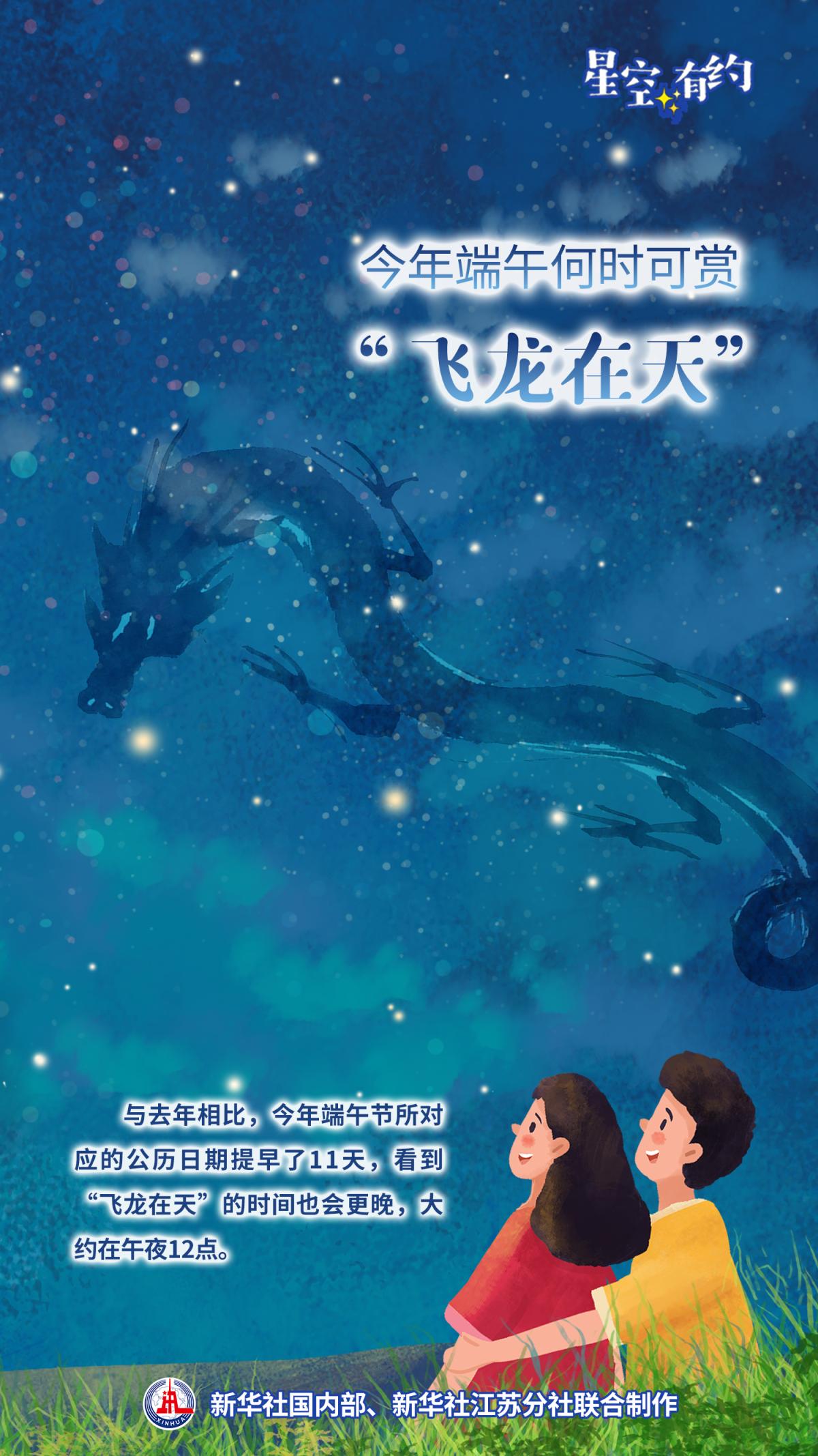 5月31日迎来端午节。当晚9时左右,苍龙七宿的“龙头”角宿会升至正南中天,到午夜12时左右,整条苍龙的“龙形”会横亘在夜空中靠谱配,亦称“飞龙在天”。