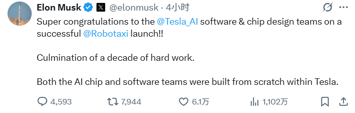 马斯克在X上表示,Robotaxi发布首日的乘坐服务的固定收费为4.2美元。