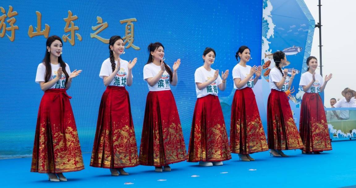 “海洋大集”威海文登区现场充满了浓浓的海洋风情。民俗秧歌《海洋欢乐颂》,秧歌舞与锣鼓、划旱船、海鲜人偶表演相映成趣,给现场注入滨海渔村的欢腾气息;歌舞《山海在路上》以山海意象勾勒地域轮廓;互动推介《夏季到山东来看海》中,网络达人“烟台霞姐”与“徐亚洲”以中英双语幽默对话,将威海海鲜美食、海岛风光娓娓道来;青岛、烟台、威海、潍坊、东营、滨州、日照沿海七市广播电视台女主持人化身“七仙女”,一曲《游山东之夏》串起滨海风情,邀请大家赶山东大集,游山东之夏,购山东好品。步入体验区,康养大集里,中医药展示与乒乓球、拉力绳表演动静相宜;“魔童闹海金沙奇缘”沙雕现场以海洋神话为蓝本,沙塑的浪花与神魔造型令人驻足;带货专区,众多主播正在直播售卖西洋参、白海参、海马、家电、农产品等特色好品;海鲜美食大集飘来鲅鱼水饺、文登烧烤的鲜香,烟火气里暗藏着胶东半岛的味觉密码。随后,群众到海滩赶海,欢笑声与广场舞律动交织,铺展着山东沿海的夏日生活图鉴。